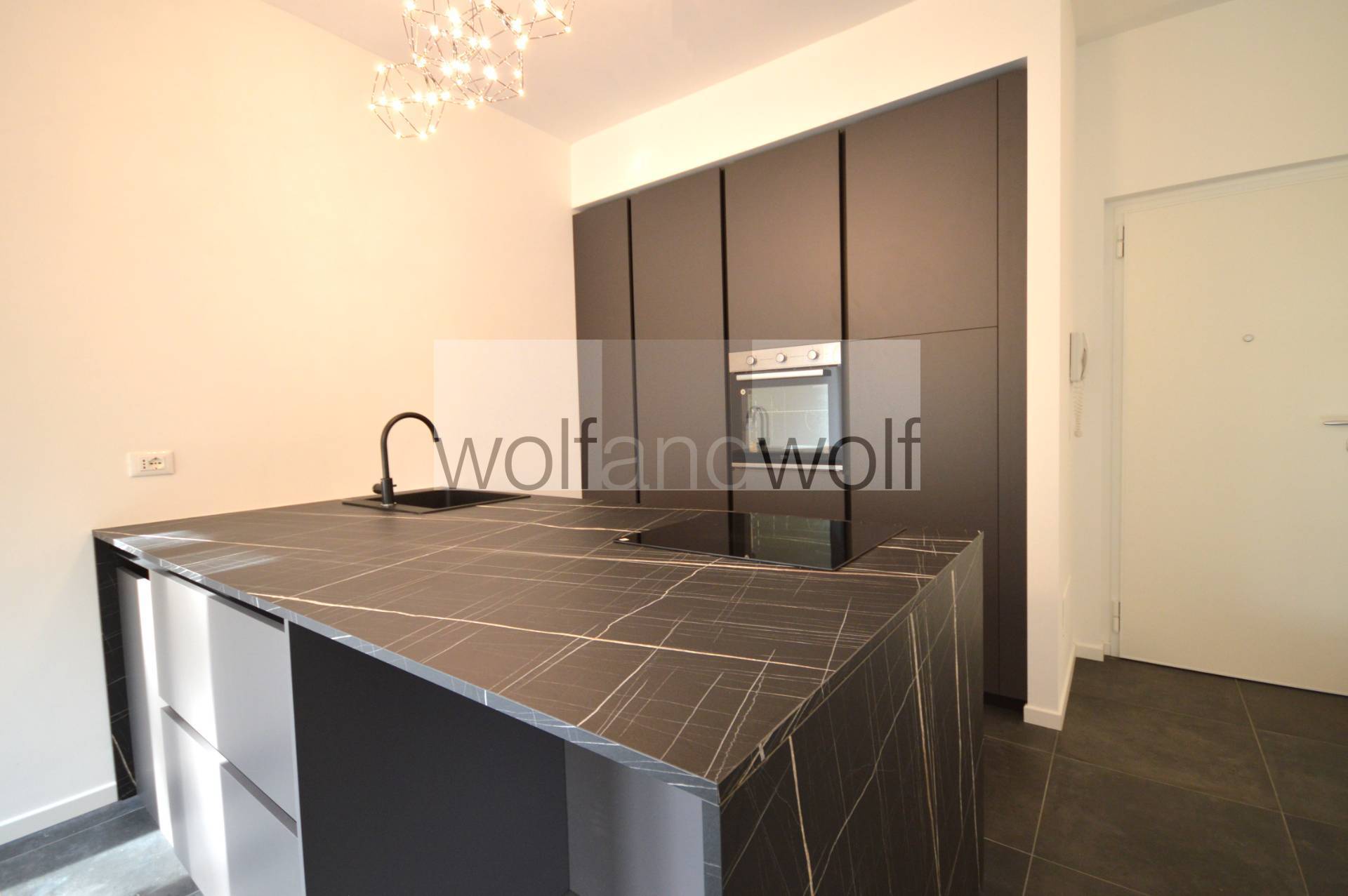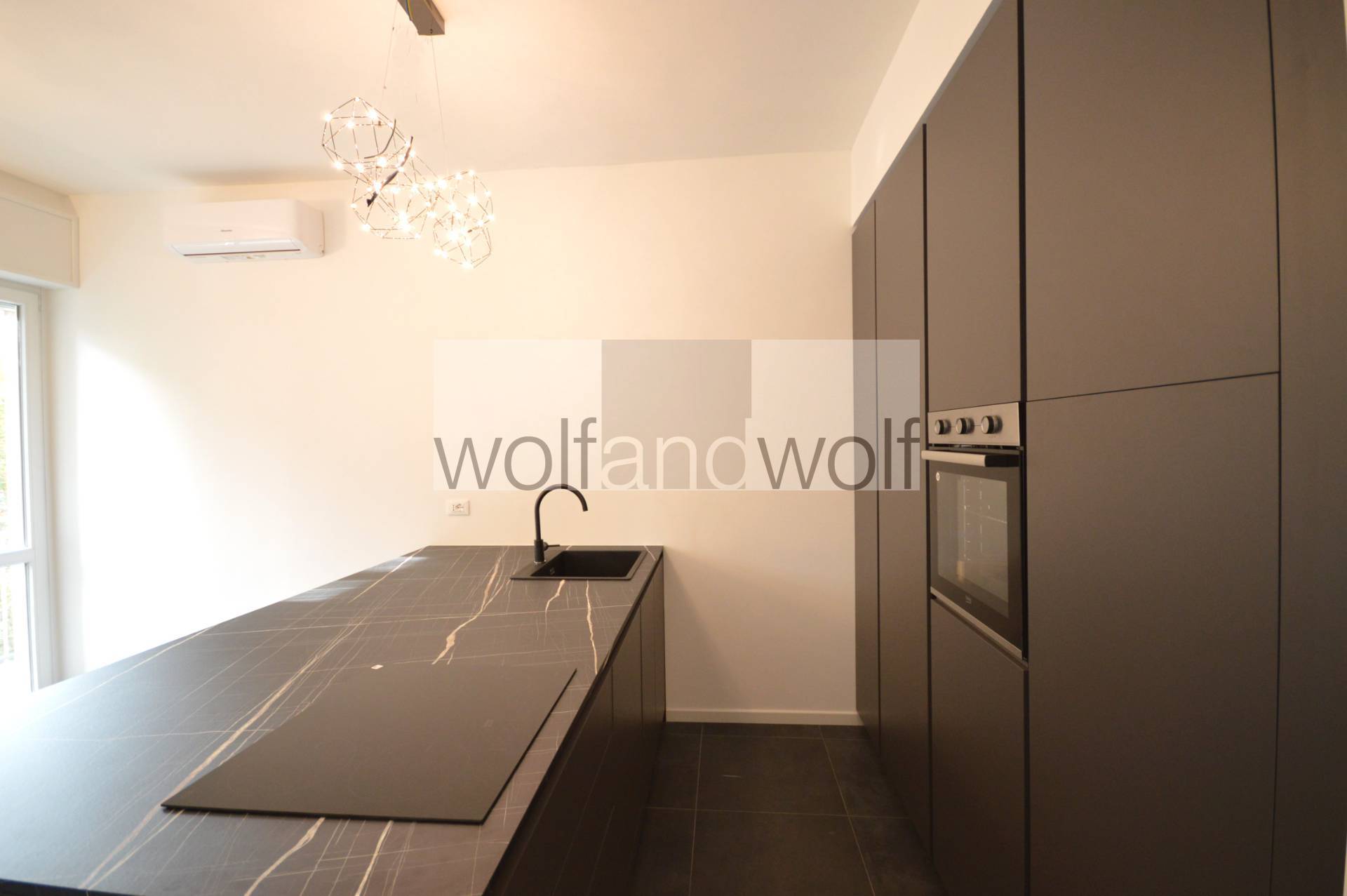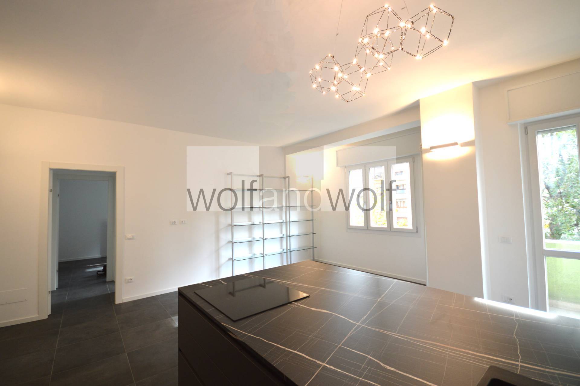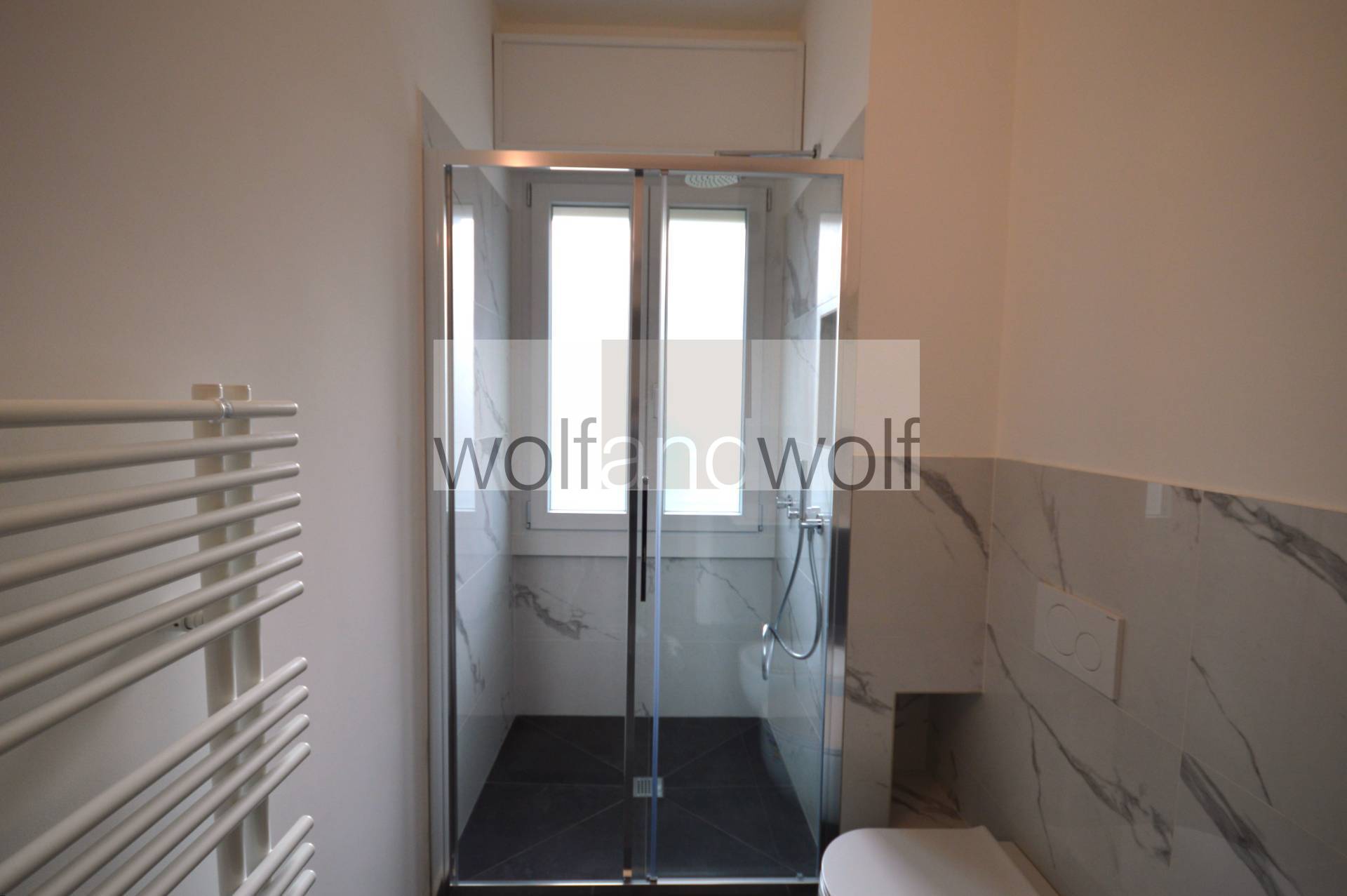 Renovated apartment on the third floor with lift, composed of: entrance into large living room with open kitchen, furnished, with peninsula, with induction hob and equipped wall, unfurnished bedroom, bathroom with shower and suspended sanitary ware, high-level storage room , two balconies and attic. All windows are triple glazed with hinged and transom opening and also anti-condensation position, air conditioning system. Availability of rental to companies.