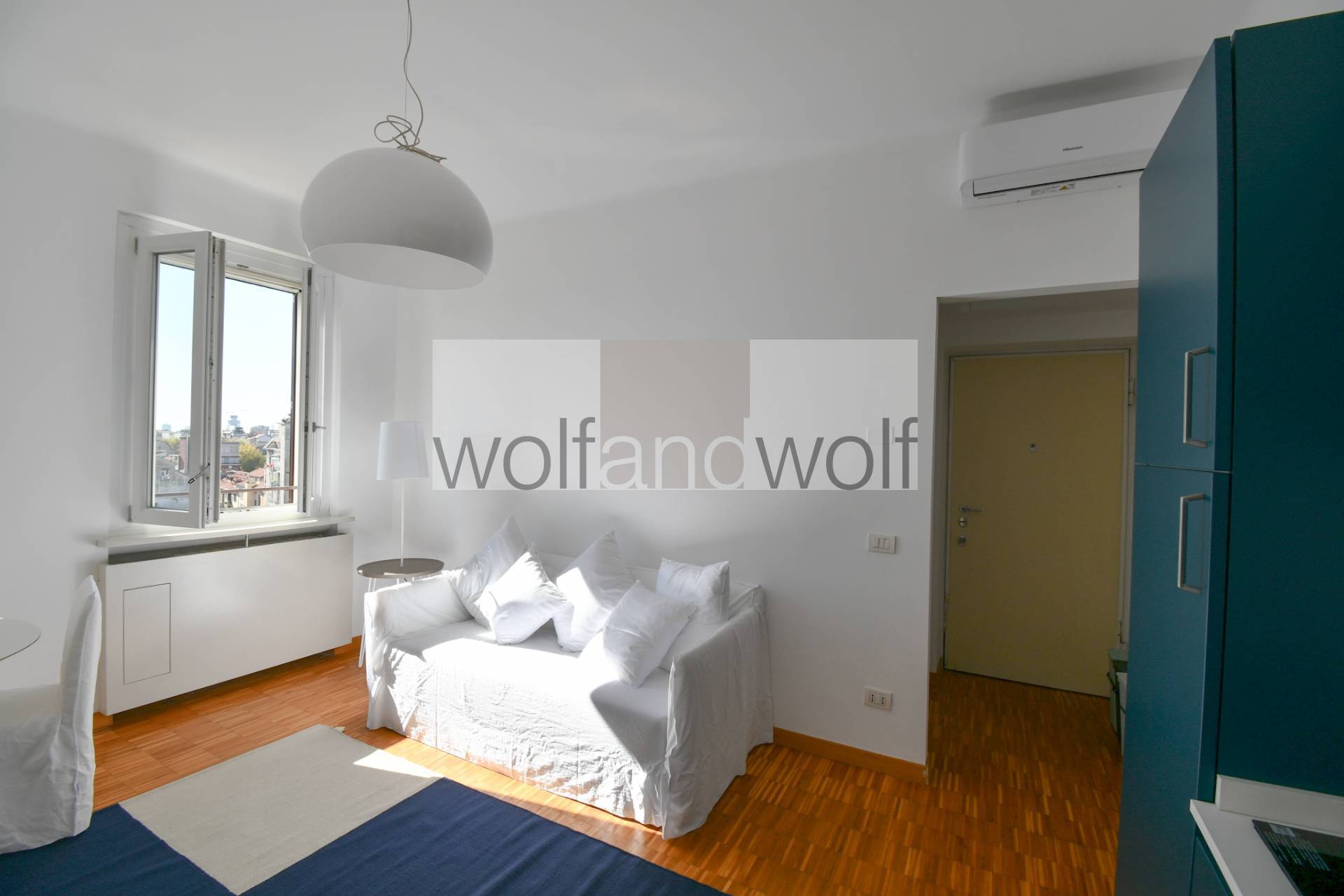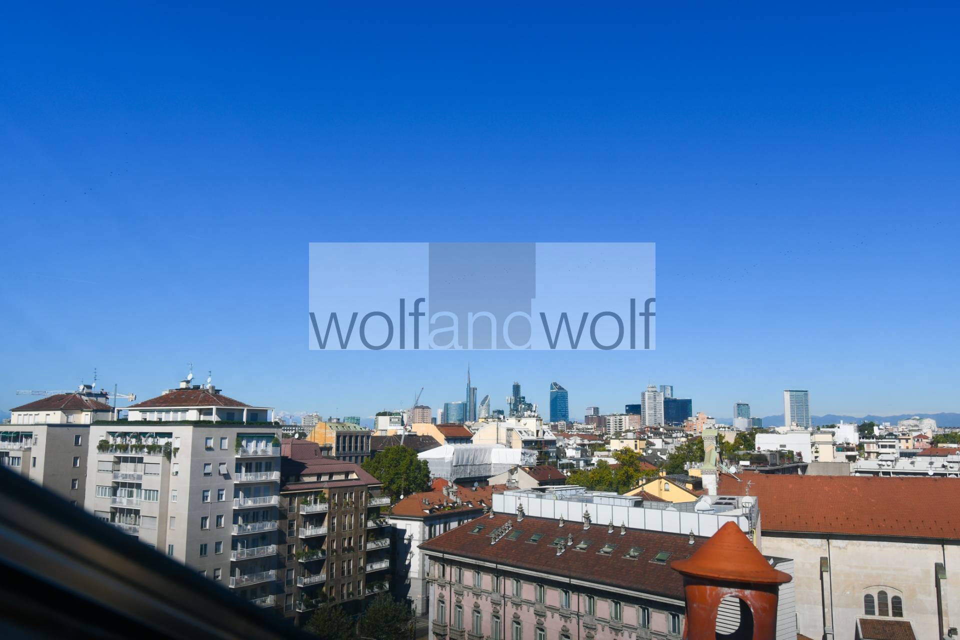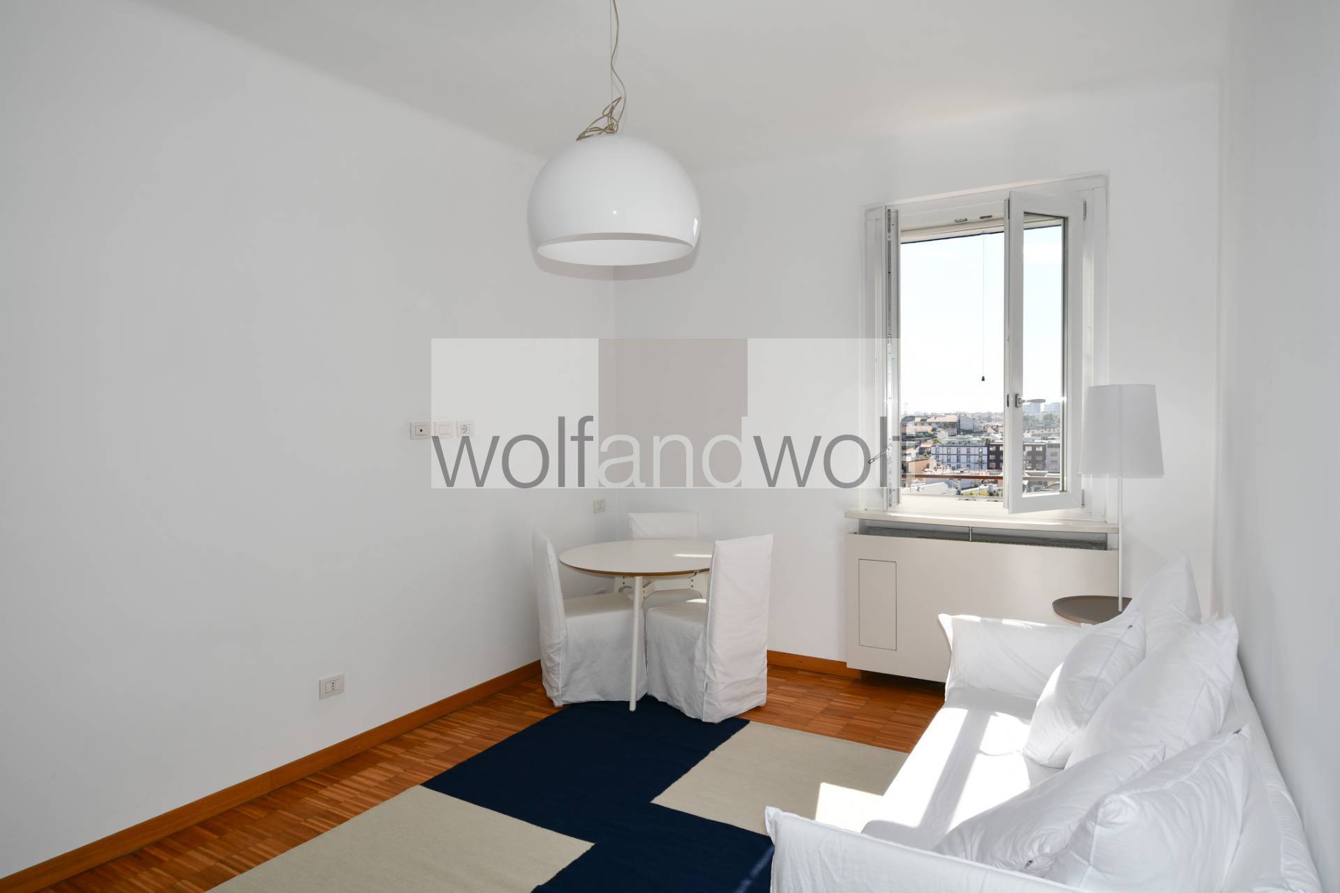 In one of Milan's most elegant and central neighborhoods, we offer for rent a recently renovated and fully furnished two-room apartment, located on the eighth and top floor of a stately building.