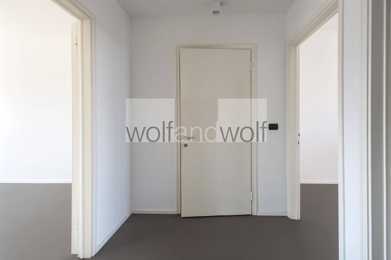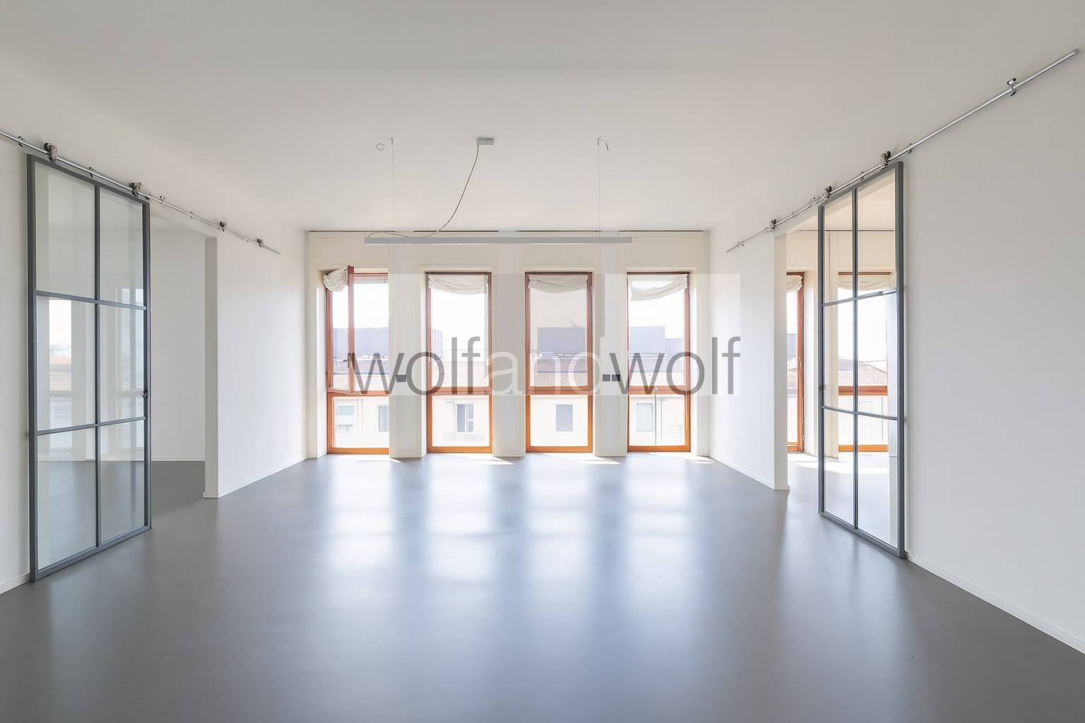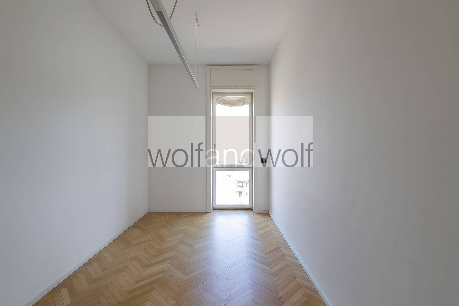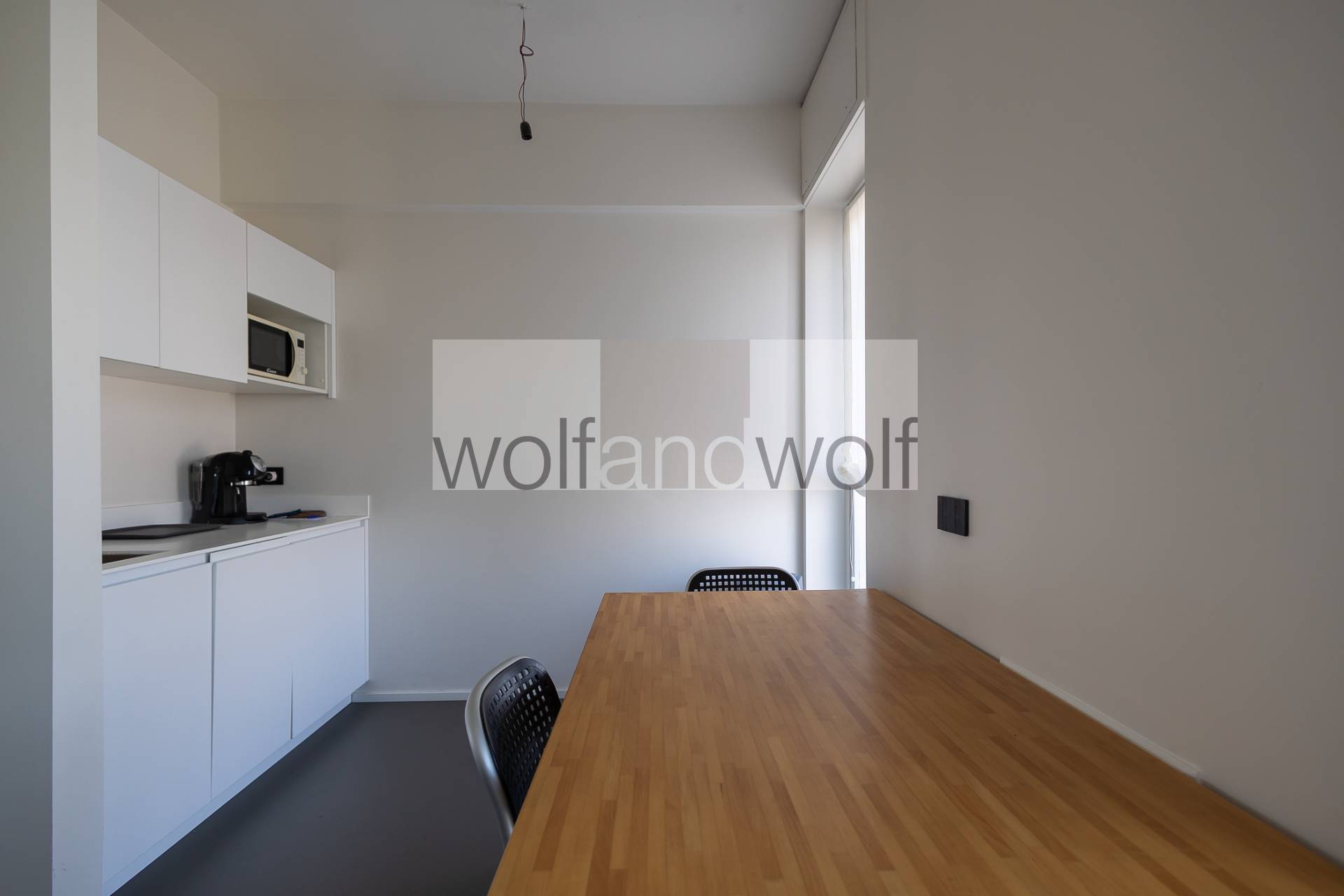 We offer for sale a bright apartment on the seventh floor of an elegant 1950s building. Currently an office, it can be converted into an apartment. We attach a plan for the apartment, which includes an entrance hall, living room, two bedrooms, an eat-in kitchen, and a bathroom.