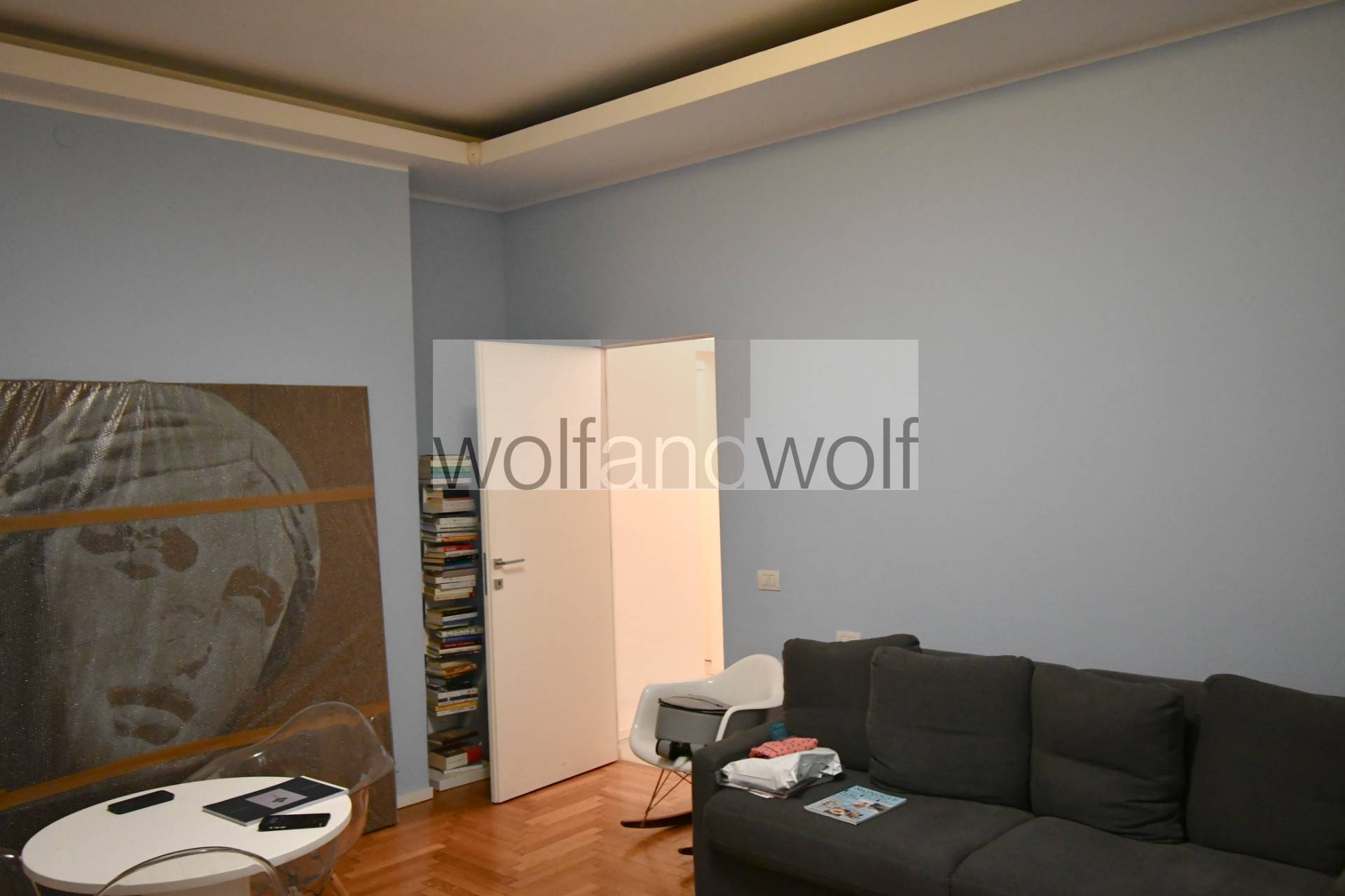 In the heart of Via Vincenzo Monti, on the first floor of an elegant period building, we offer a 55 m² apartment that combines historic charm and modern comfort. The entrance opens into a bright living room with kitchenette, embellished with original details that maintain the home's character.